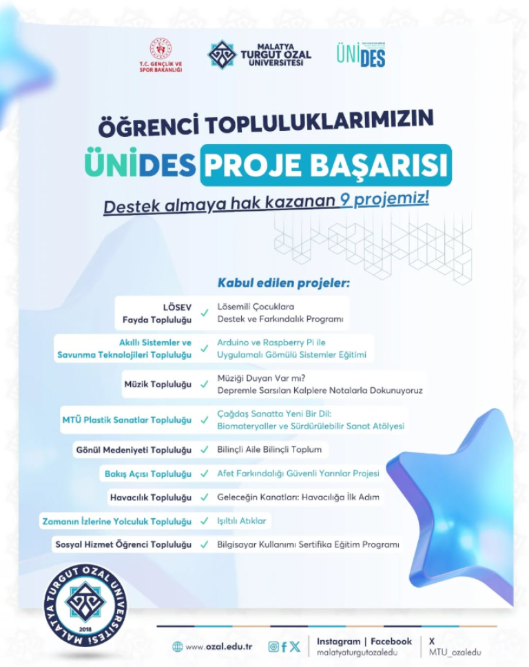 Malatya Turgut Özal Üniversitesi (MTÜ), ÜNİDES - Üniversite Öğrenci Kulüplerini Destekleme Programı kapsamında, gençlerimizin kişisel, akademik ve sosyal gelişimlerine katkıda bulunurken, aynı zamanda topluma fayda sağlamayı hedefleyen projelerle büyük bir başarı elde etti. Destek almaya hak kazanan projeler, hem yerel hem de ulusal düzeyde geniş bir etki yaratmayı amaçlıyor.